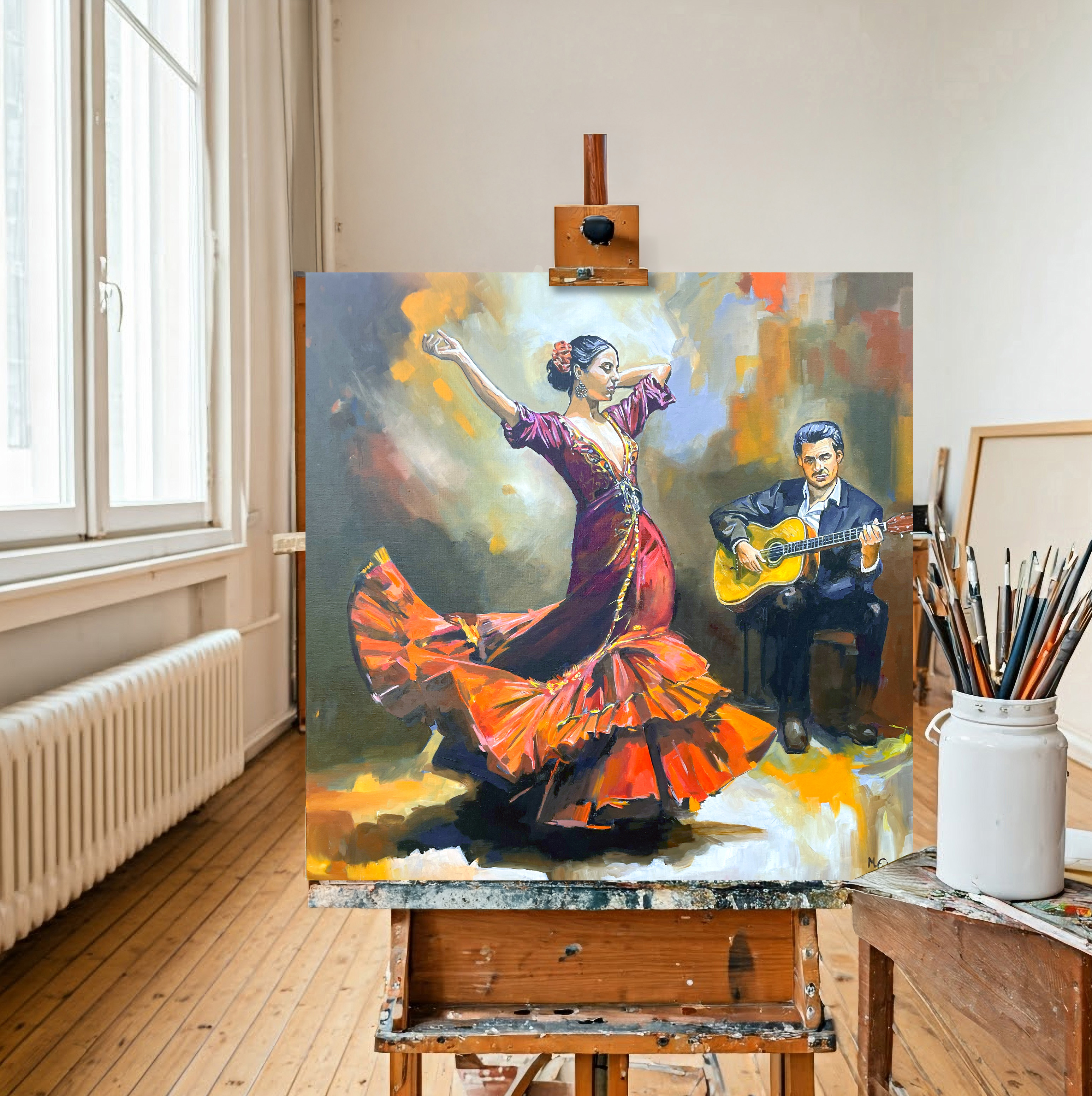 Le choix du rouge et du noir pour la robe n’est pas qu'esthétique. C'est le symbole d’une lutte intérieure : le noir pour l’élégance austère et les secrets enfouis, le rouge pour l'explosion vitale qui déchire le silence. L’arrière-plan, aux tonalités **terreuses et brûlantes**, agit comme un écho organique à cette passion. Il rappelle que le flamenco ne vient pas du ciel, mais des profondeurs du sol, des racines mêmes de la douleur et de la joie.