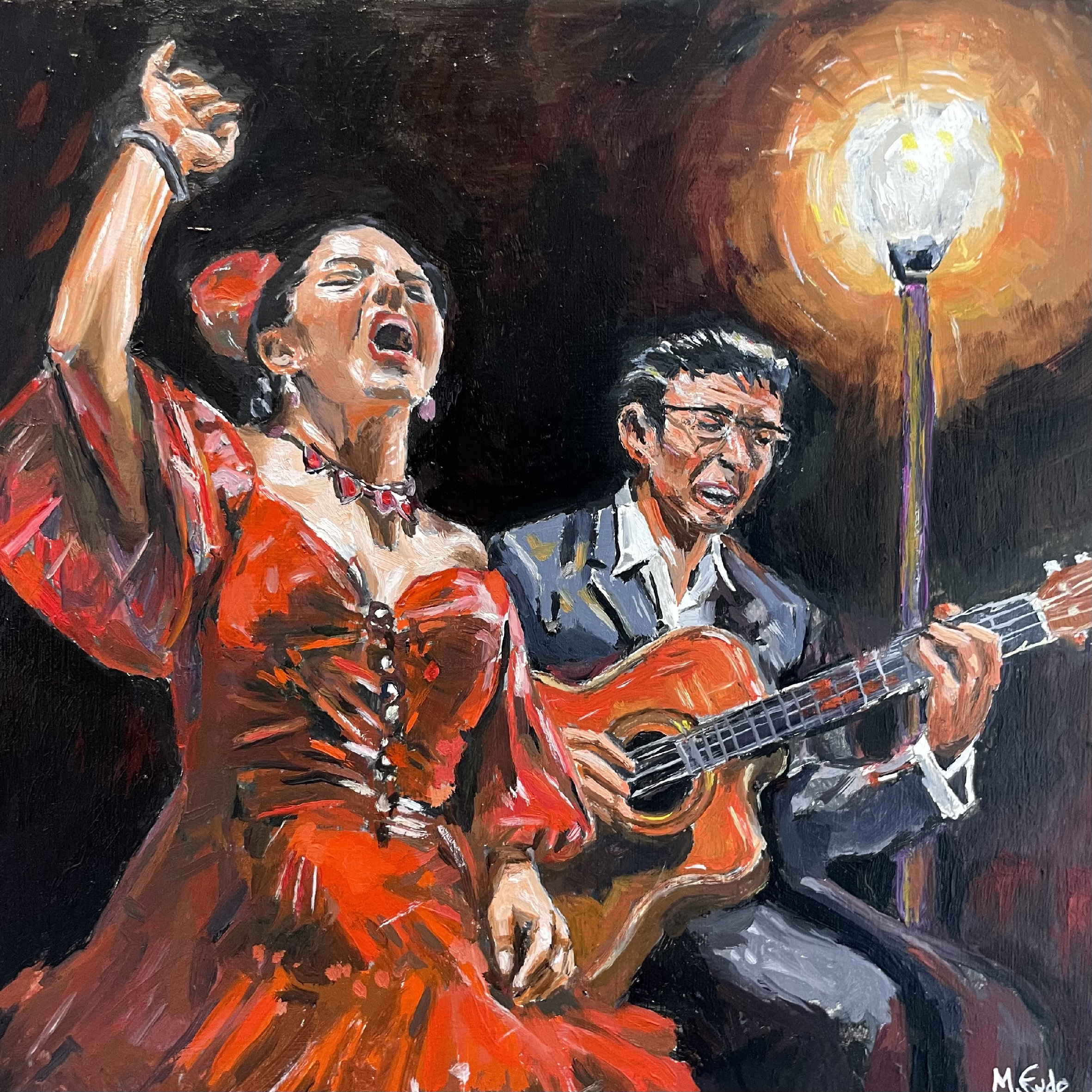 Sous ce lampadaire complice, le chant et les cordes s'unissent pour capturer l'âme éphémère du flamenco, là où la passion défie l'obscurité de la rue.