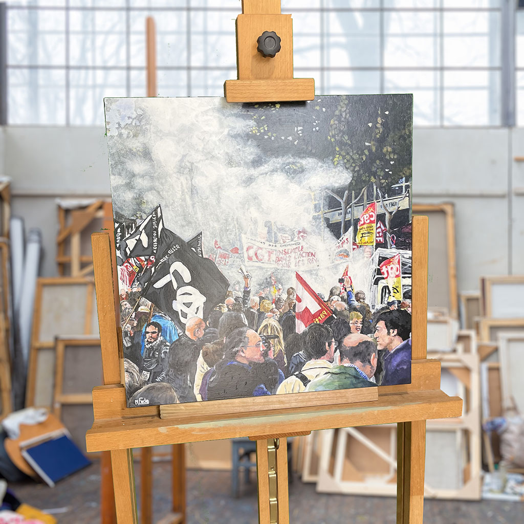 Ce tableau représente une manifestation à Lyon qui a réuni des travailleurs de différents secteurs, des syndicats, des étudiants et d'autres personnes concernées.